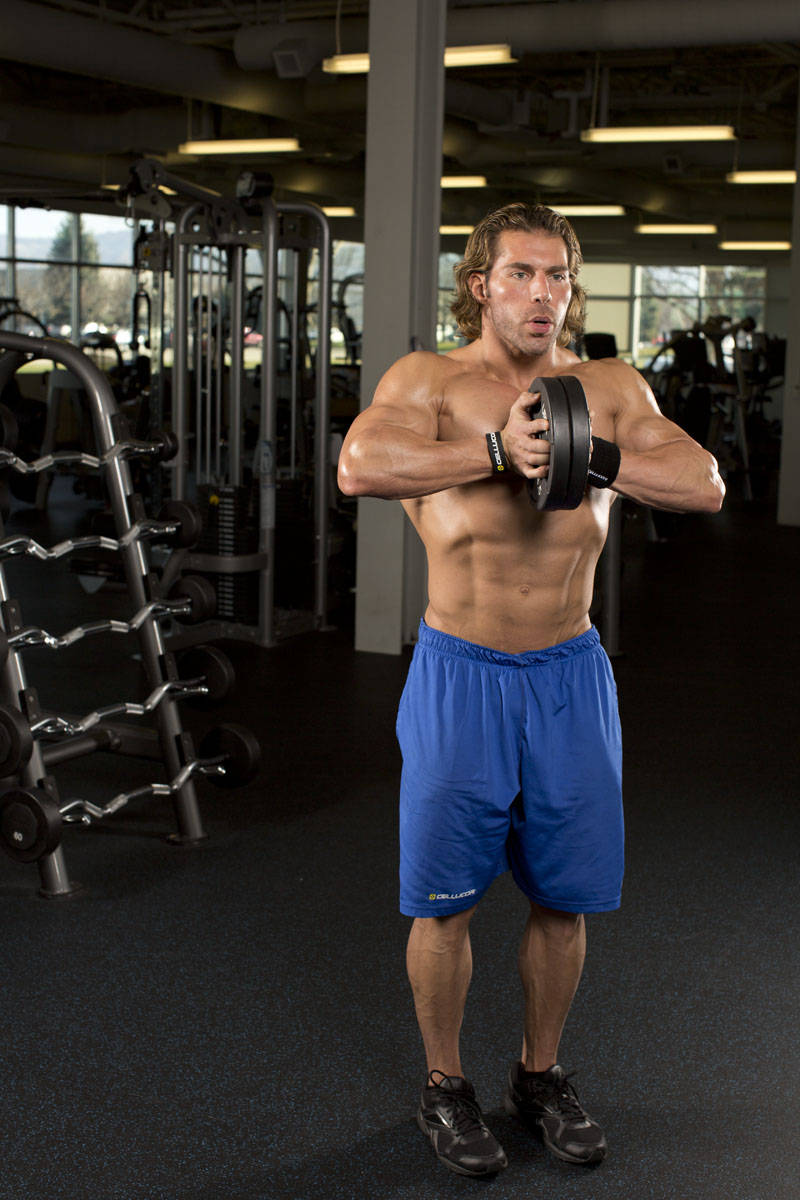 - Press two lightweight plates together with your hands. Hold the plates together close to your chest to create an isometric contraction in your chest muscles. Your fingers should be pointed forward. This is your starting position.