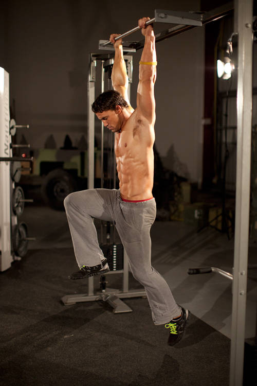 1. Hang from a pull-up bar using a pronated grip. Your arms and legs should be extended. This will be your starting position.